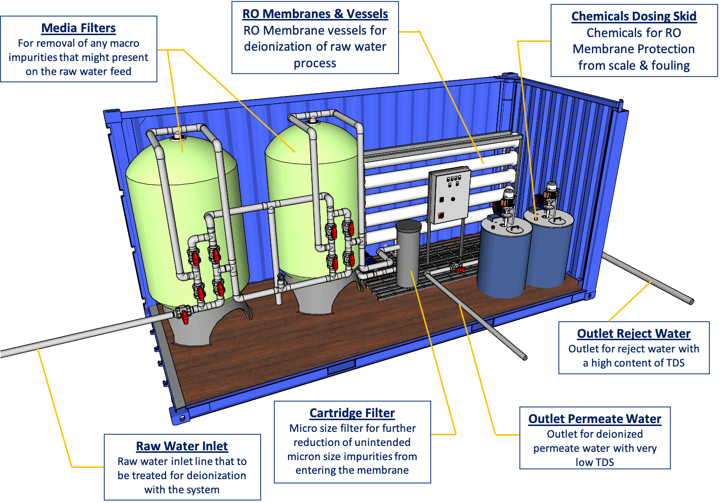 The POWER SHIVA™ unit mainly consists of a raw water pretreatment system to condition the water prior entering the RO membrane & the RO membrane filtration unit itself. Depending on the raw water source, the pretreatment unit may vary. POWER SHIVA™ units are able to produce demineralized water instantly from various sources of raw water, to supply your demineralized water needs.